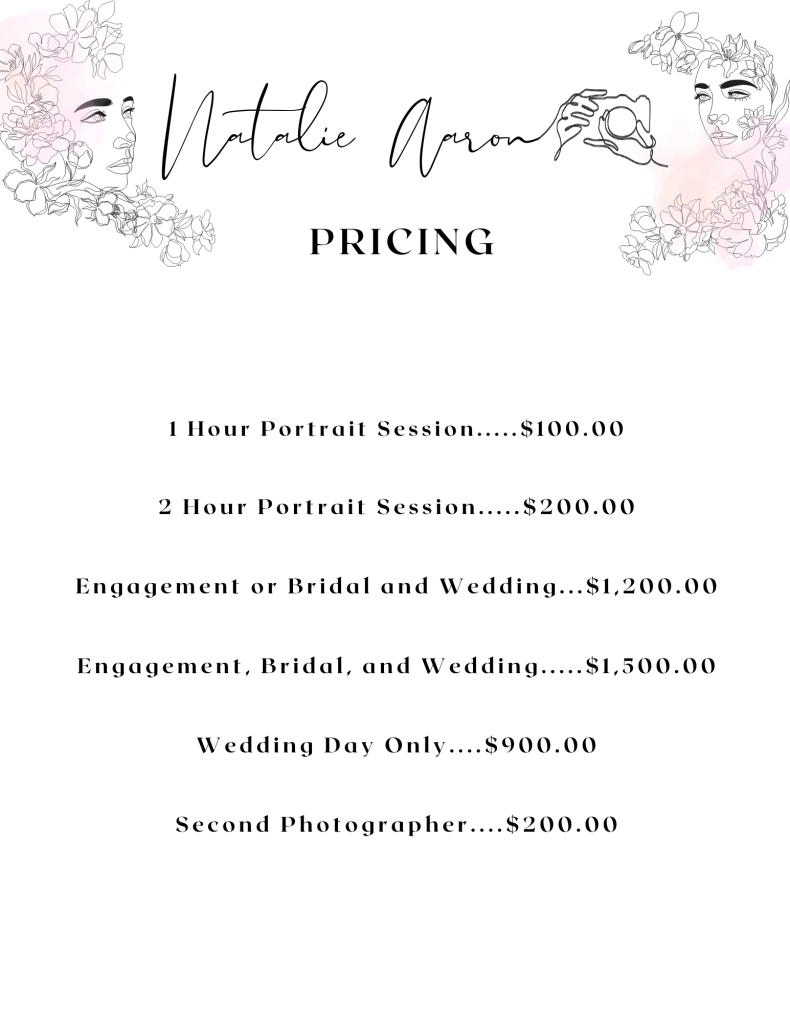 Please Note if you have any questions or concerns about pricing feel free to reach out. All packages can be modified to fit what you are looking for. As well as edited images are INCLUDED in the package price list with no added fee for edits.